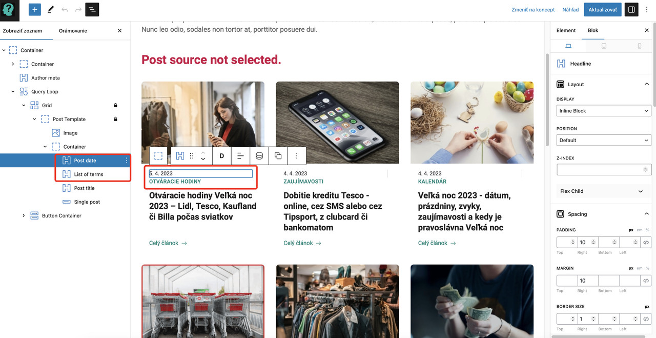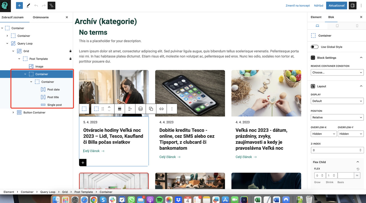 Hi, great. Have a look at Category Archive (https://cotoje.wp-server.cz/wp-admin/post.php?post=8298&action=edit) and this Container Block https://i.postimg.cc/T3mZHGjF/img-1.jpg.